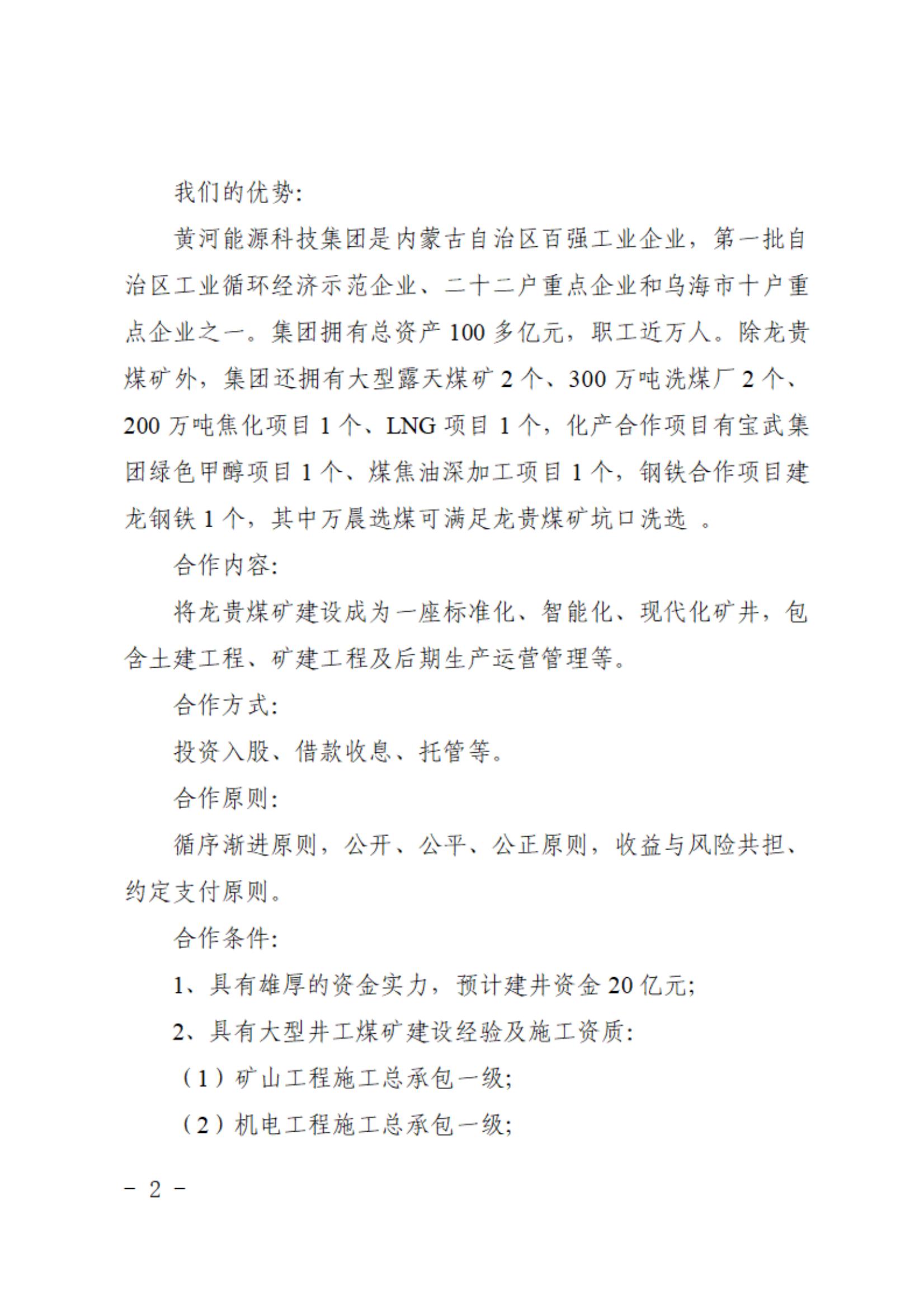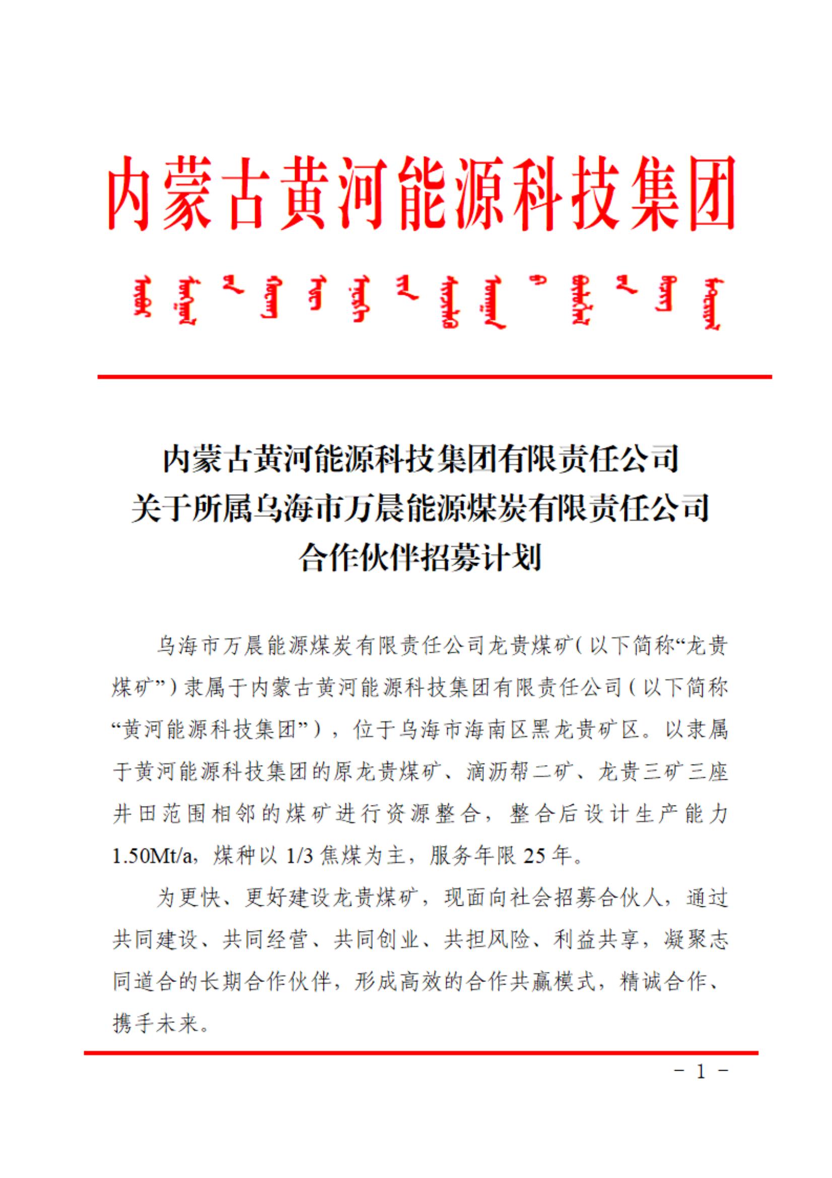 內(nèi)蒙古黃河能源科技集團有限責(zé)任公司關(guān)于所屬烏海市萬晨能源煤炭有限責(zé)任公司合作伙伴招募計劃